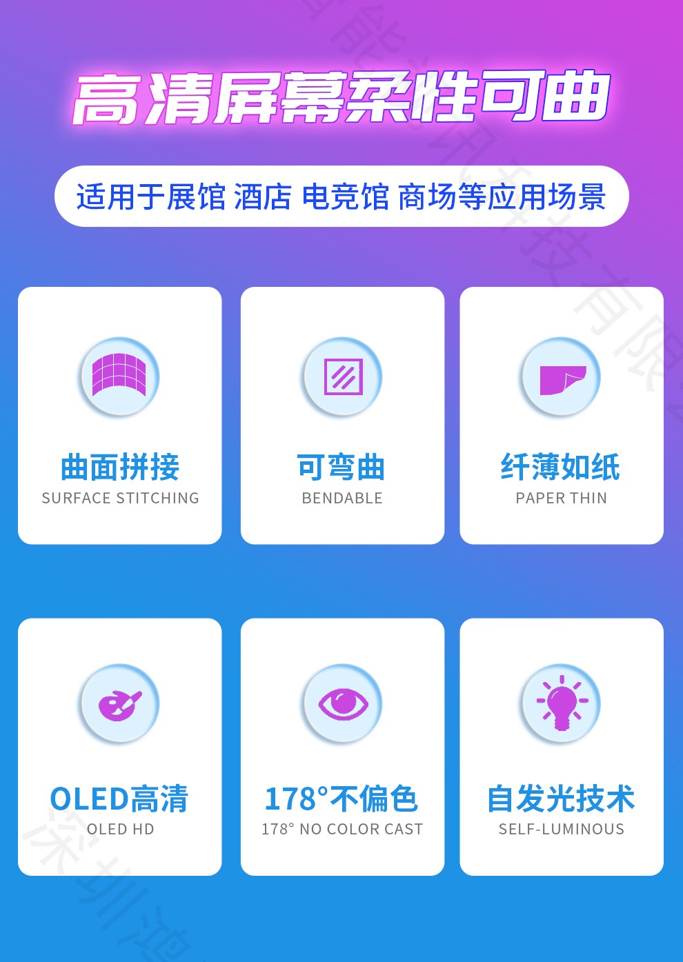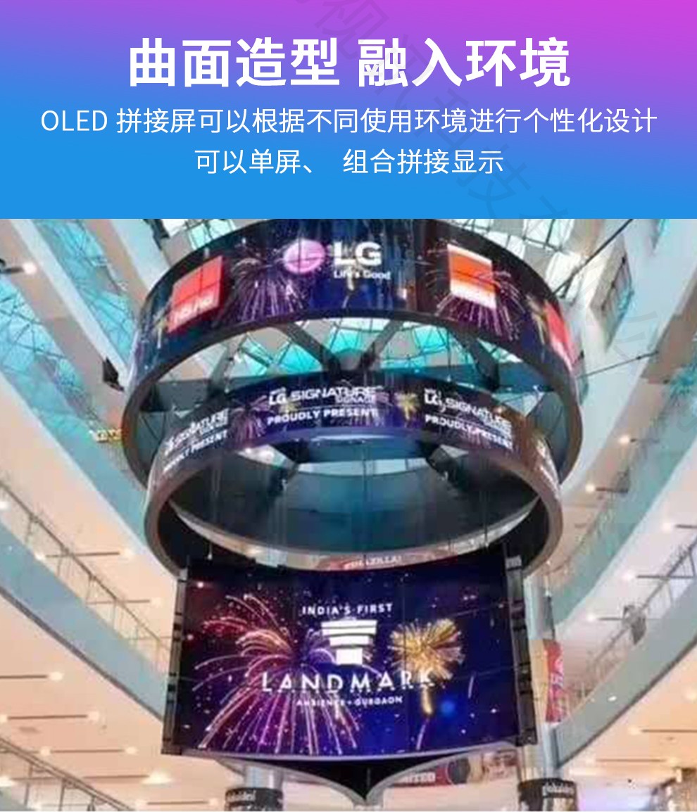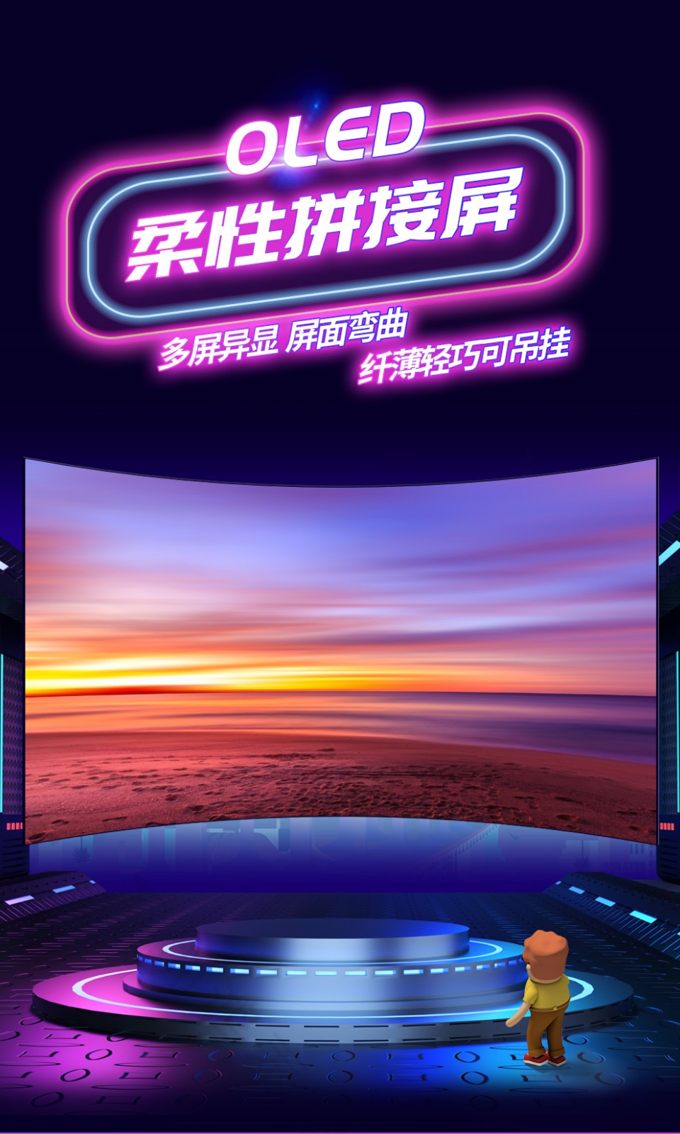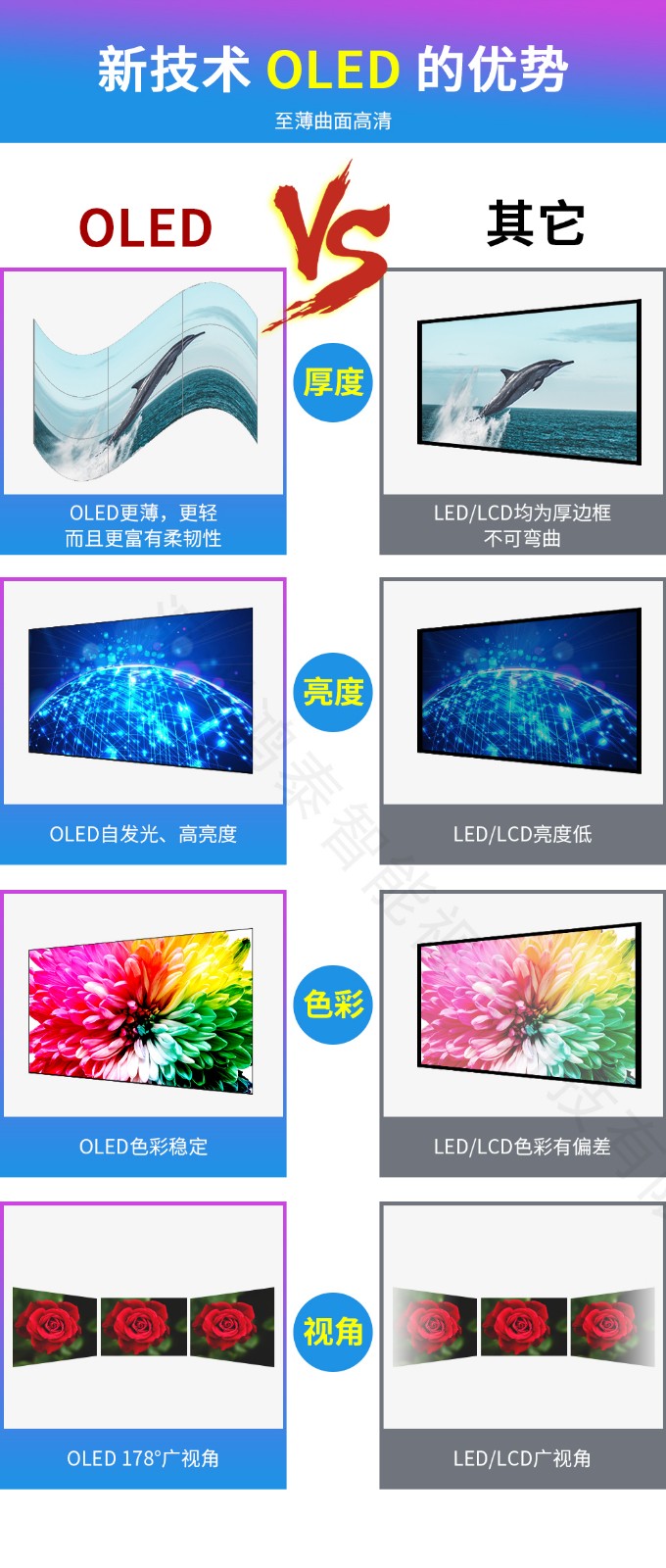 OLED面板主要分三大类型:小尺寸用屏,TV用屏、工业级用屏,最开始进入市场的是AMOLED,主要应用于手机和穿戴设备,随着技术的革新逐步往大尺寸发展,大尺寸OLED首先进入的是TV市场,属于电视机用屏(家用),进入商显市场是在2015年2016年左右,公司是2018年开始规划OLED,2019年启动OLED项目,而我们的产品属于工业级面板,主要供应:OLED透明屏和OLED柔性屏。目前全球具备大尺寸OLED面板批量生产能力的厂商有LG,主要尺寸有55/65/77/88,而55寸是常见量产尺寸。