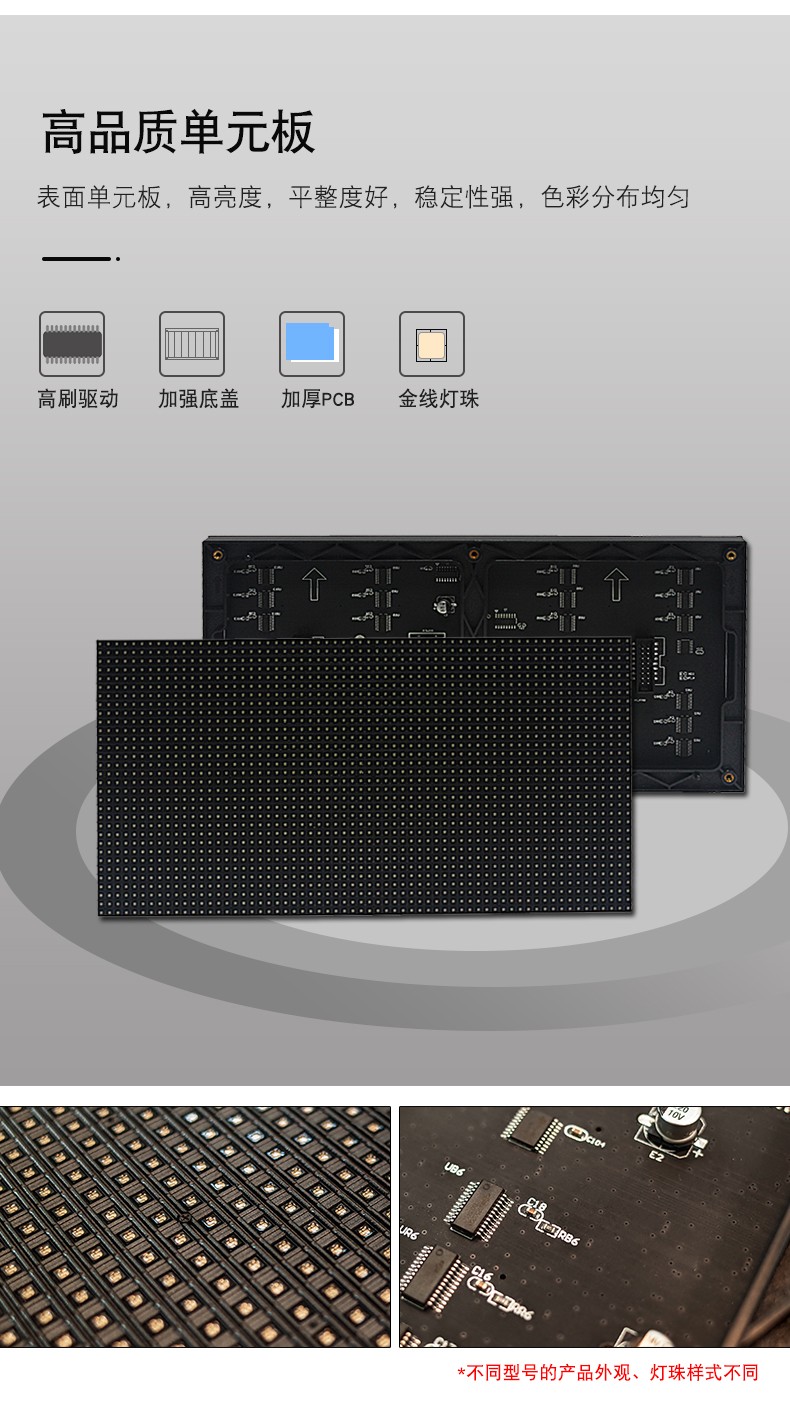 | 1 | 室内表贴三合一全彩屏 | P1.25 | SMD1010 | 640000 | 256*128 | 320*160 | 1R1G1B | 64S | 简易箱体/密封箱体/压铸铝箱体,灯驱合一 |