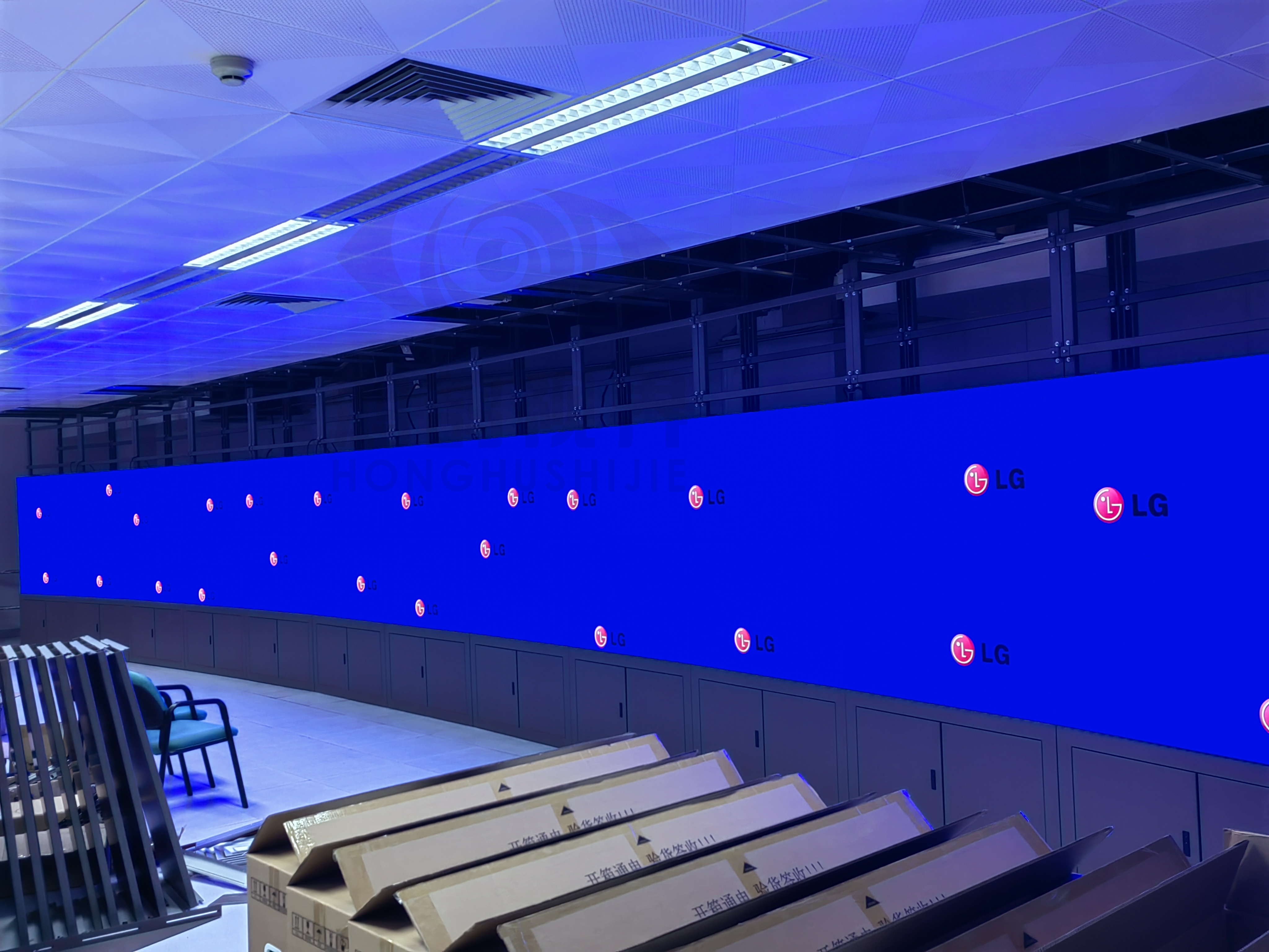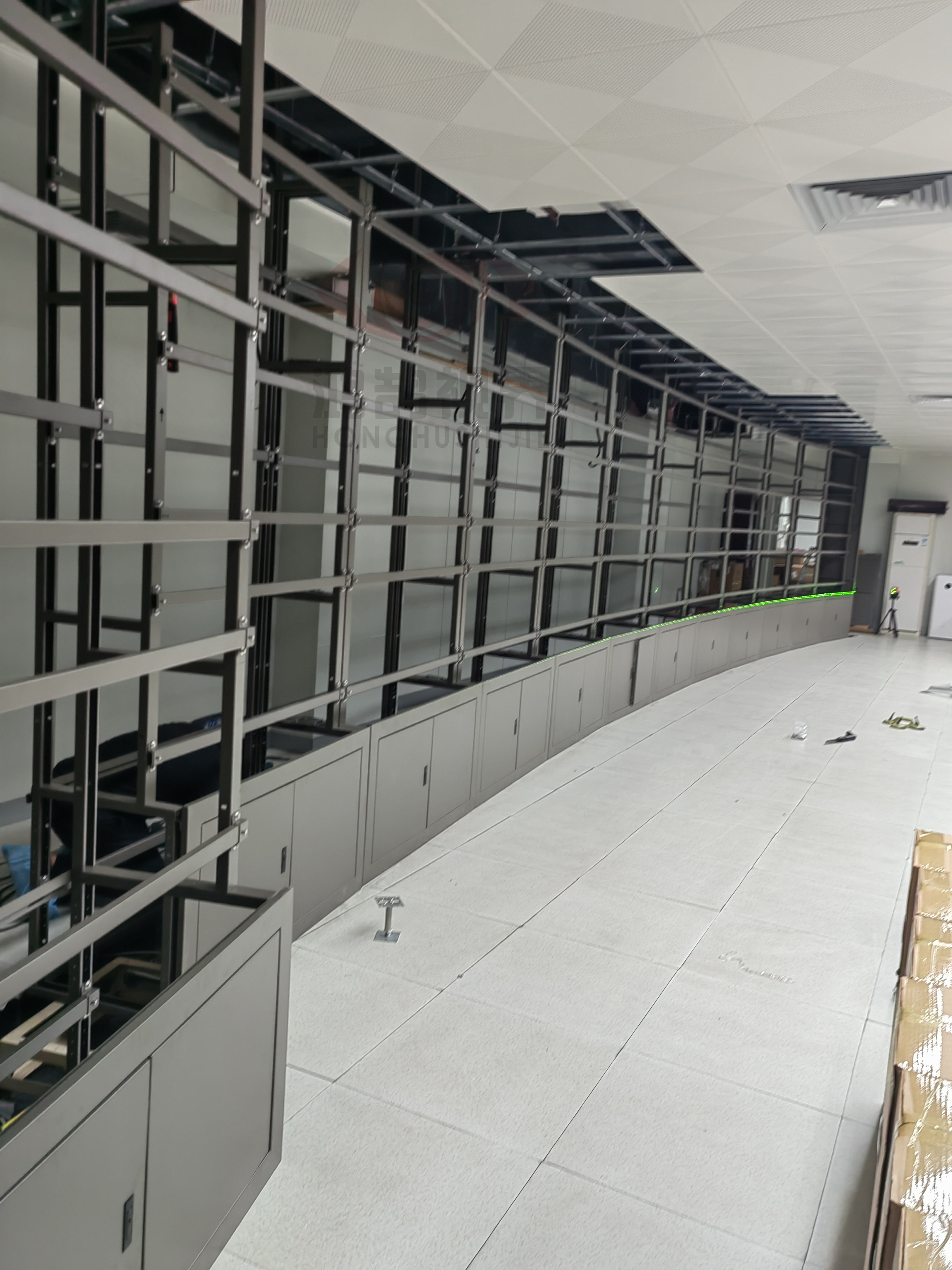 采用了55英寸0.88mm拼接缝隙, 三行一十二列的弧形机柜定制而成拼接方式